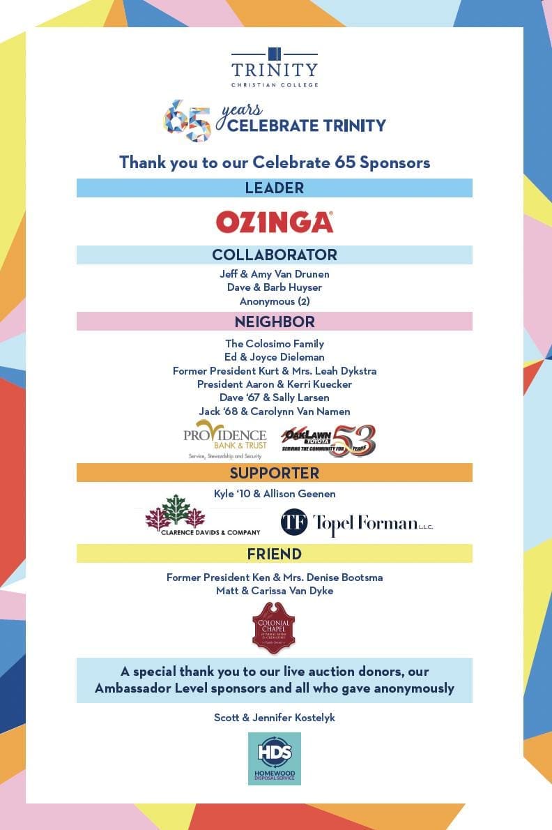 “We had a beautiful night celebrating 65 years of Trinity,” said Vice President for Advancement, Mackenzi Huyser. “Our student emcees shared incredible stories about their time at Trinity and how significant the scholarship support they received has been to their journeys. Thank you to all who have made the Trinity experience possible for these amazing students.”