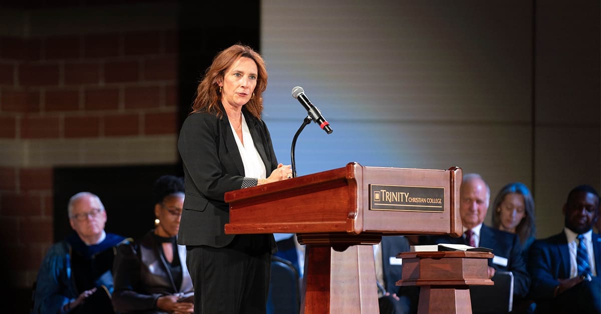 Dr. White, a friend of President Kuecker’s, shared stories of their holy friendship throughout the years and how she reacted when he told her that he had accepted the position of President at Trinity Christian College. She talked about how President Kuecker’s humble servant leadership will be a breath of fresh air in higher education and shared stories of how his vastly different view of seeing abundance in the world versus scarcity will set Trinity Christian College on a path to thrive for many years.