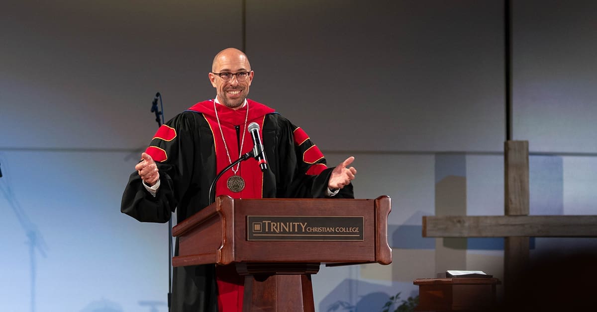Christian Perry ’16 opened the ceremony with a warm welcome and invocation. He reflected on his more than a decade at Trinity, first as a student and now as a member of the Board of Trustees. He proclaimed, “Today is a good day,” as he shared how President Kuecker’s leadership continues Trinity’s longstanding legacy and is shaping its future for good. The invocation was followed by a powerful version of “You are Good” performed by Trinity’s student worship team.