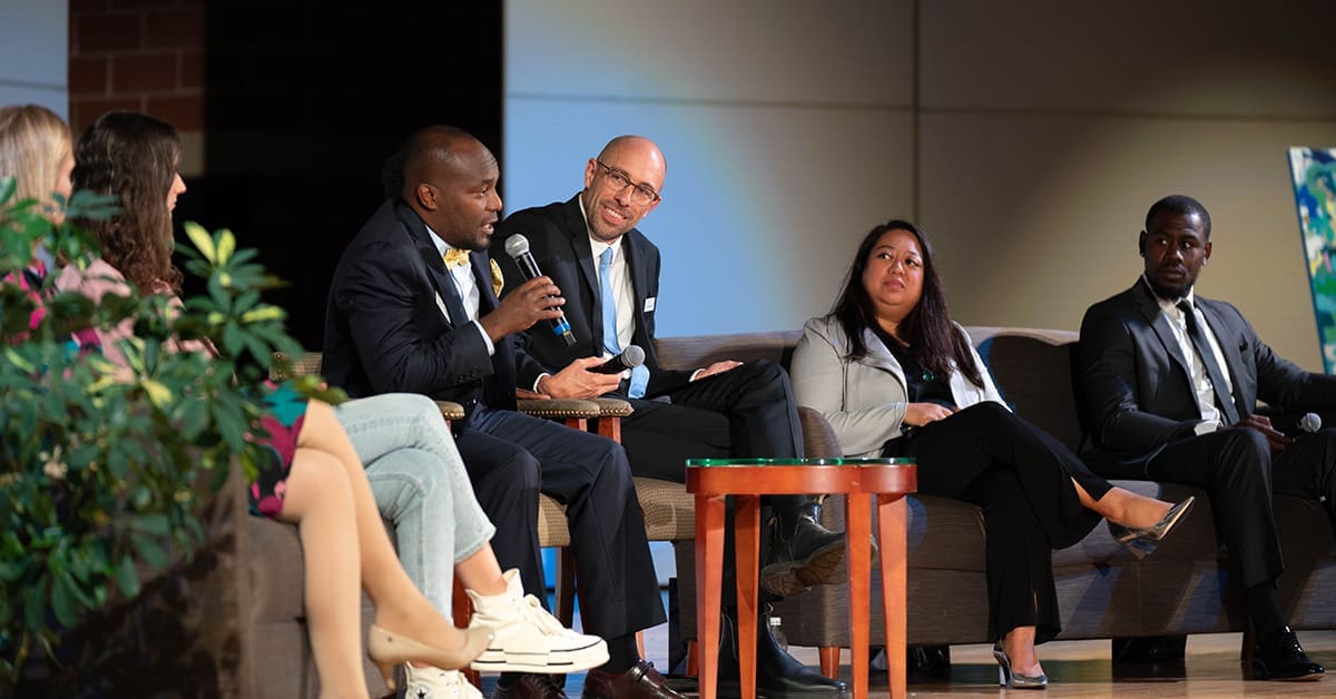 Later in the afternoon, a story-sharing session with neighborhood partners and newly inaugurated President Kuecker in the Chapel Auditorium came together to Celebrate Collaboration. The panel group took questions from the audience and talked about the recently launched collaborations with the College that have positively impacted reducing student debt and enhancing wellbeing.