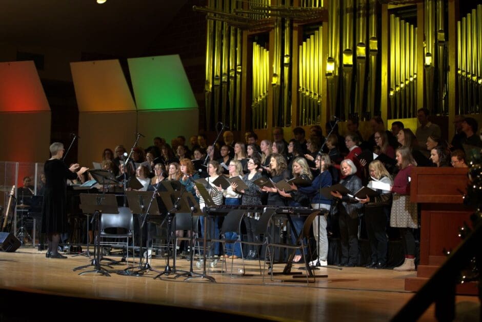 During Christmastide, audience members joined in singing Christmas hymns, such as “Joy to the World,” “O Come, O Come, Immanuel,” and “Jesus, the Light of the World,” with ensemble members. One of the highlights of the evening was Dr. Helen Van Wyck, Former Professor of Music at the College, conducting the song “Stay With Us” for one last time. This piece brought together almost 70 Trinity alumni, staff, faculty, and community members on stage at the end of Christmastide to commemorate the special moment.